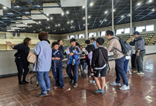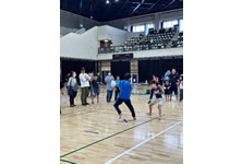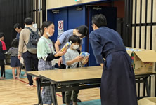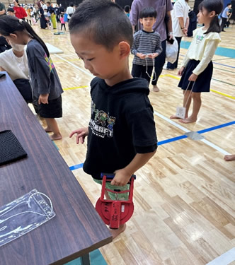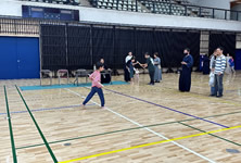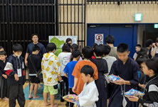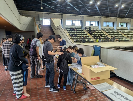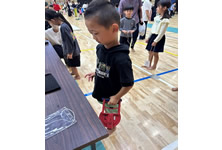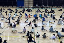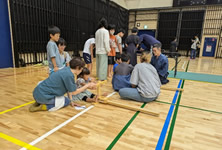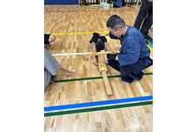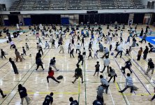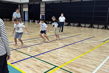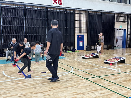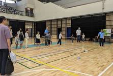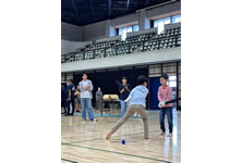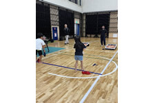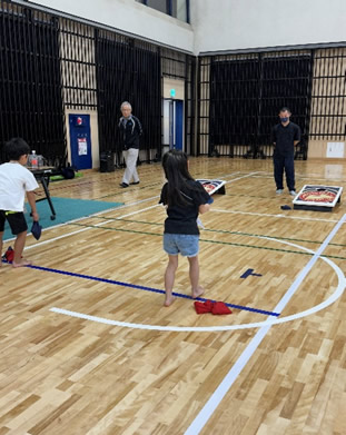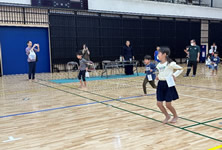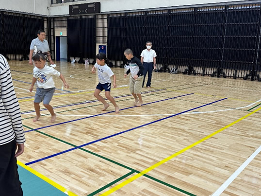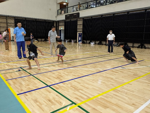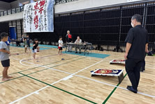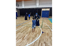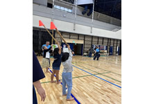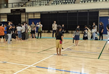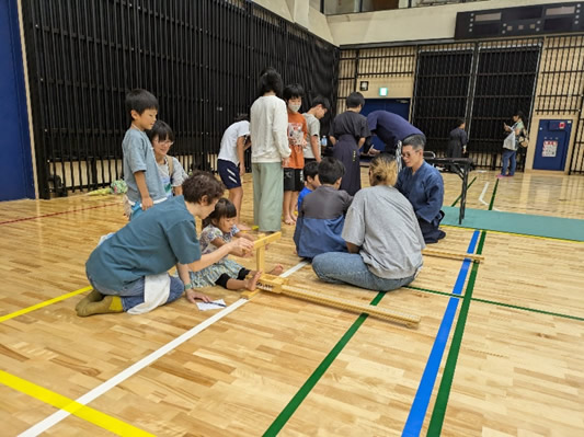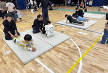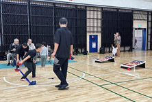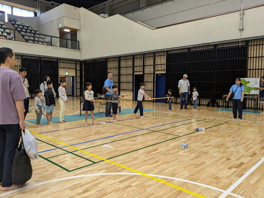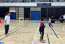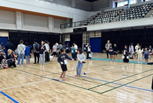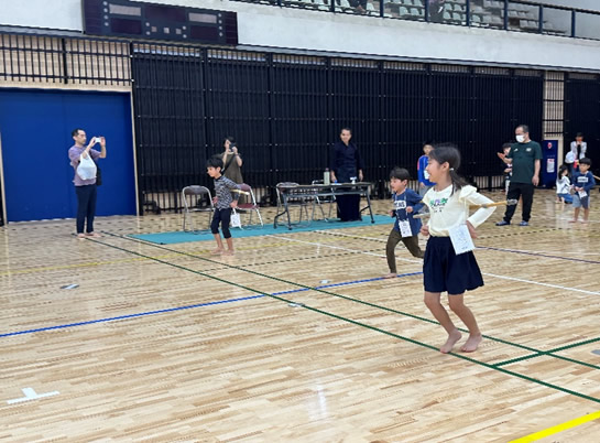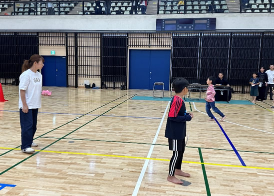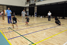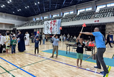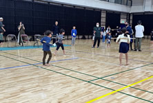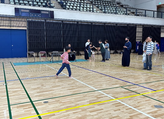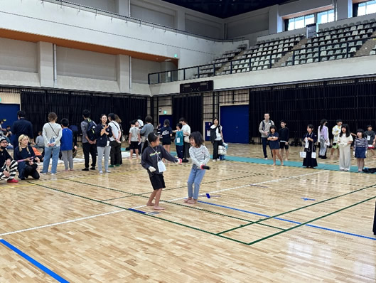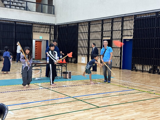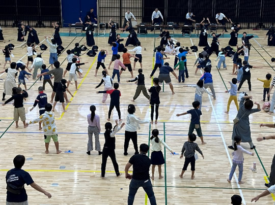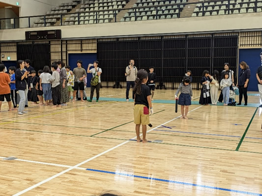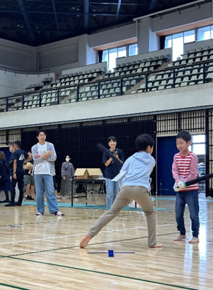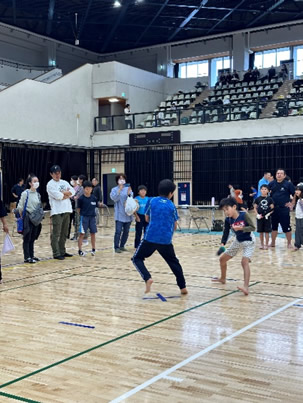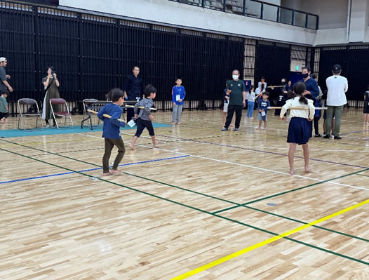 小学生や年少/年中/年長の皆さんが柏市中央体育館 アリーナでチャンバラ競技をやったりコーン飛ばしをしたり、